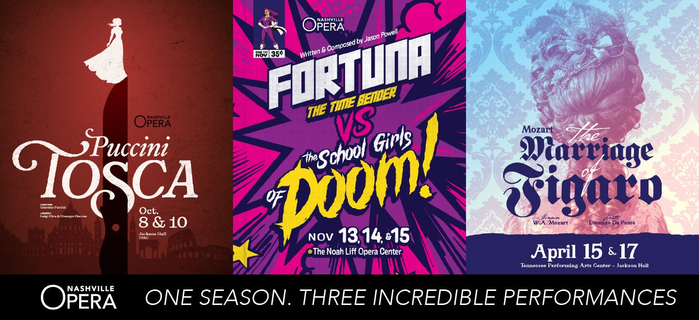 Nashville Opera's 2026-27 season is one for the books. We open with Puccini's Tosca, a deadly political thriller set in Rome where passion, power, and betrayal collide in less than 24 hours. Then we do something completely different: Fortuna the Time Bender vs. The Schoolgirls of Doom, a comic book superhero opera with a live 80s rock band and more laughs than you'll know what to do with. We close with Mozart's The Marriage of Figaro, back on our stage after a decade, dressed in powdered wigs and Marie Antoinette excess, where the women are smarter than everyone else in the room, and they know it.